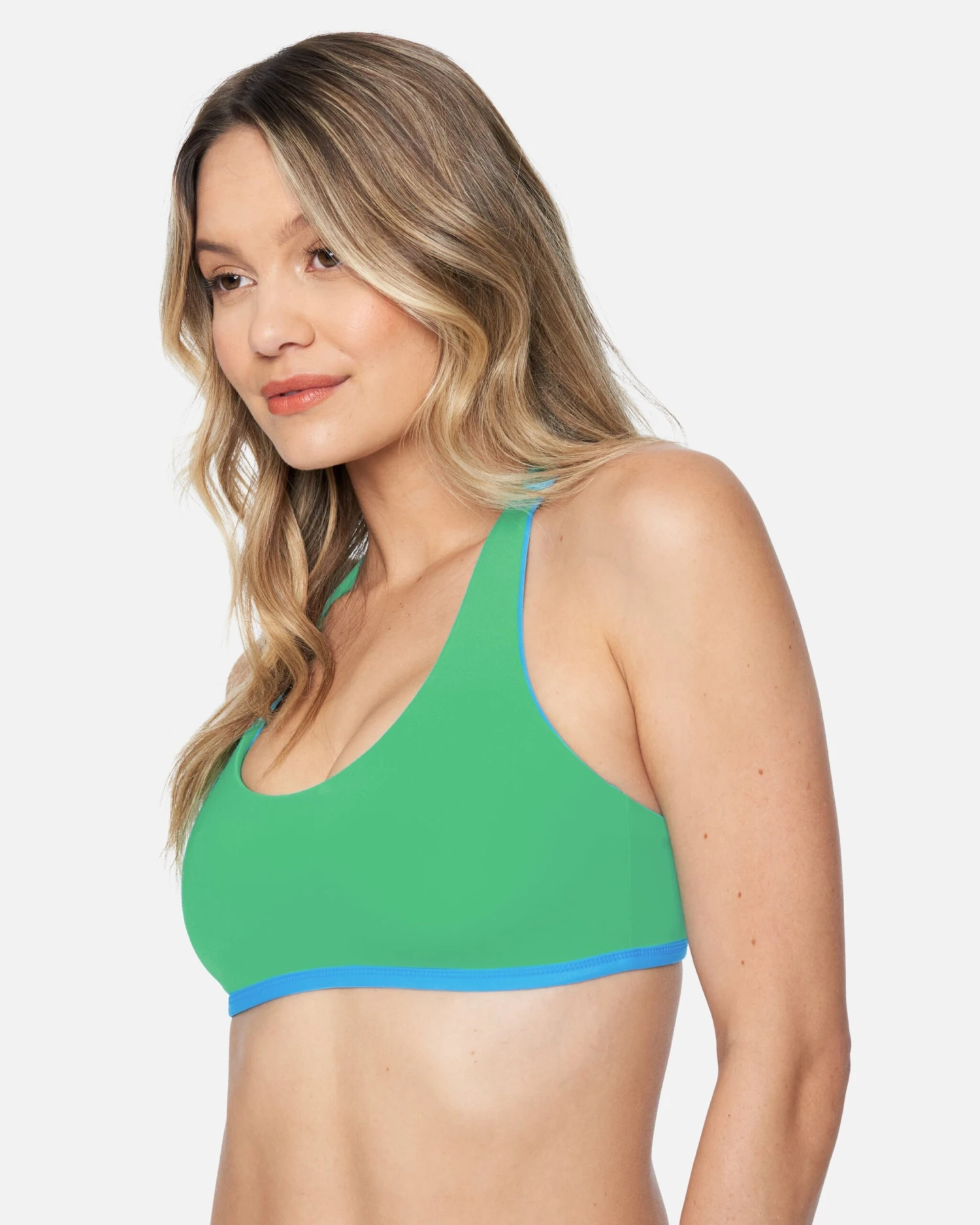 Keep it classic and sporty in the One And Only Solid Reversible Scoop Bikini Top which features a scoop neck and racerback fit for zonal support. Added bonus: it’s reversible so you get two tops in one. Score.