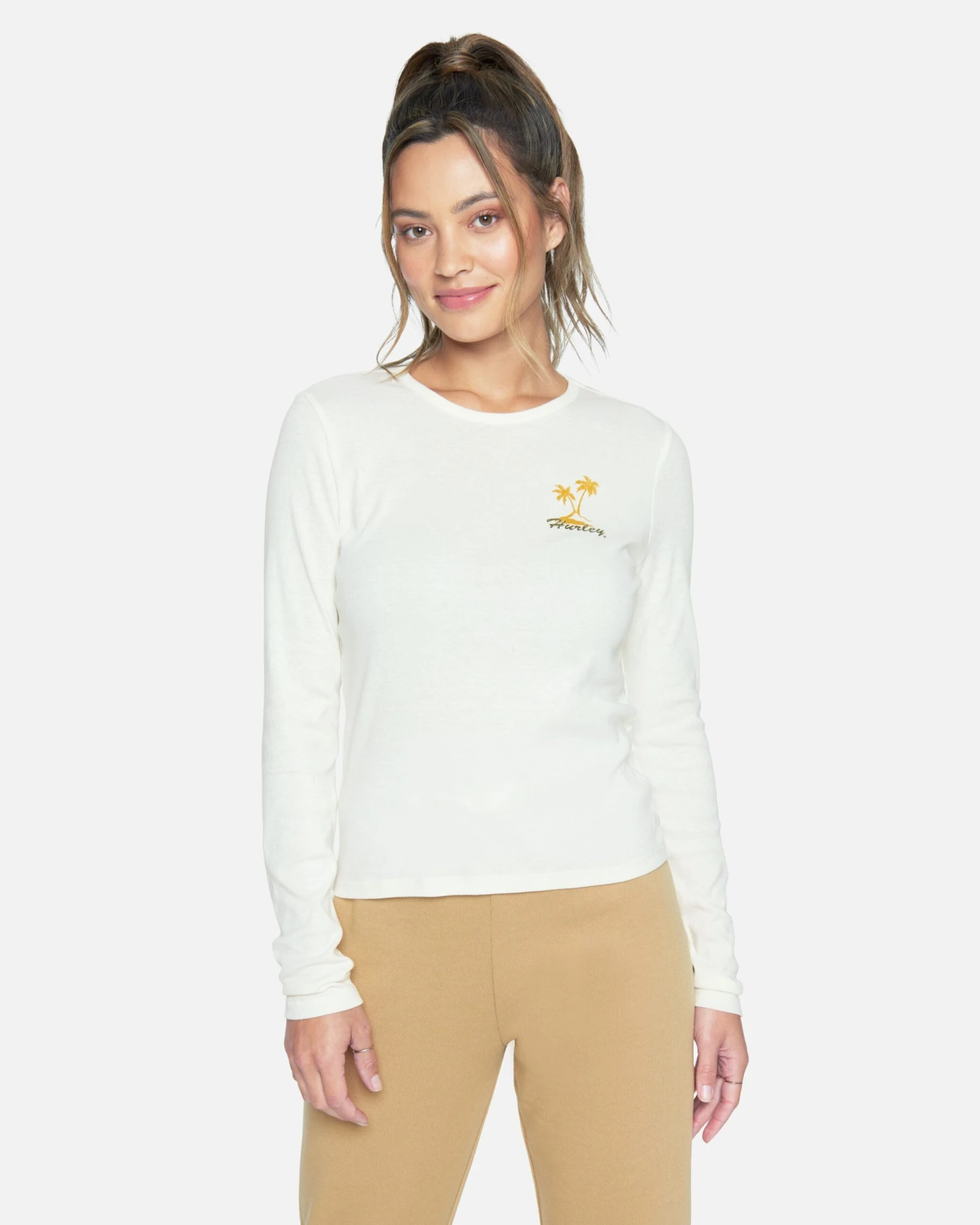 Retro vibes meet tropical vibes in the SNA LONG SLEEVE RIB BABY TEE, a slim fitting baby tee that looks great with cut off or your favorite workout leggings.